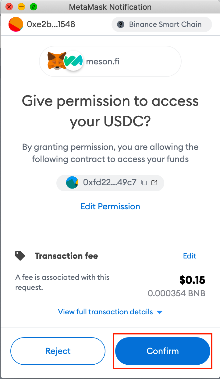 - In MetaMask, click Confirm to give permission to Meson to access your funds.