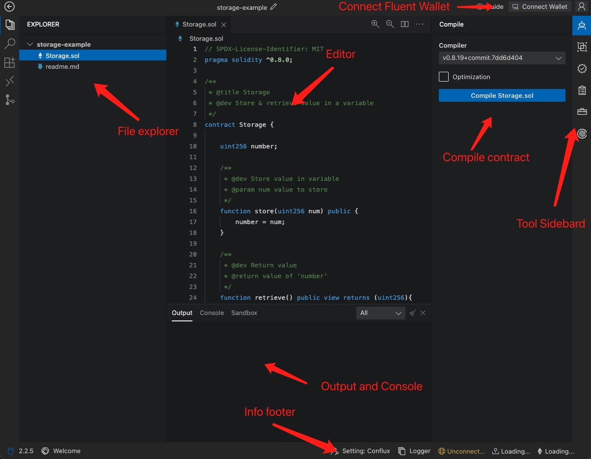 Before deploying this contract to the Core Space Testnet, connect your Fluent Wallet. Click the Connect Wallet button at the top right of the window.