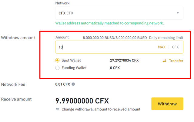 通过Conflux Core Space将CFX从币安转移到Fluent。