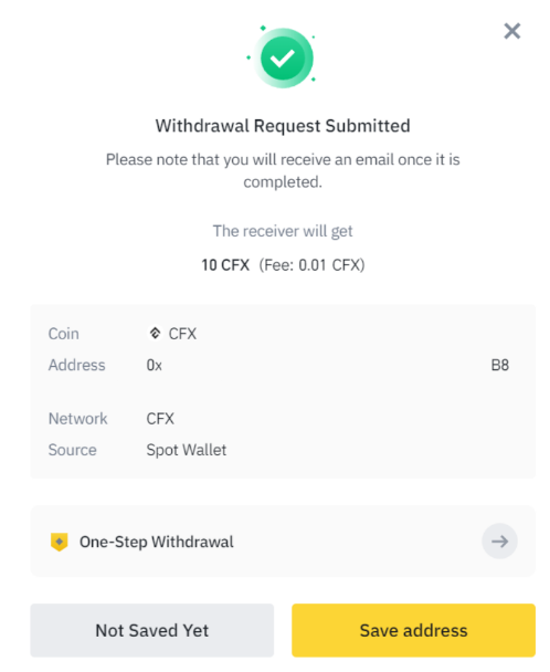 恭喜! 您已成功地将 CFX 从币安转移到您在 Conflux Core Space 上的 Fluent 账户中。